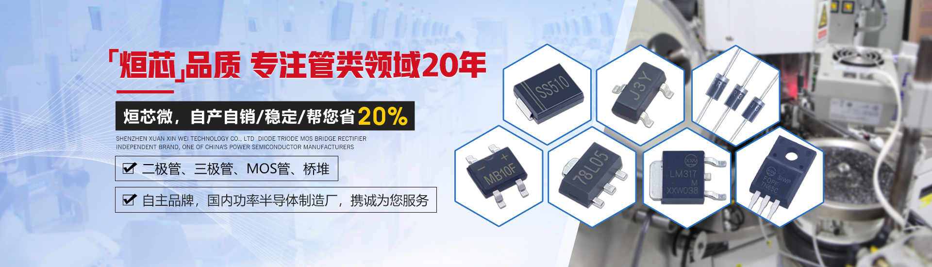 深圳市烜芯微科技有限公司是一家集研發(fā)、生產(chǎn)、銷售于一體,專注于二極管、三極管,MOS管、橋堆等功率半導體領(lǐng)域發(fā)展的企業(yè)。采用國際領(lǐng)先的GPP芯片生產(chǎn)工藝及一心多Die高精密制造工藝,擁有功率半導體器件工程實驗室,全自動高精密生產(chǎn)設(shè)備,產(chǎn)品層層把控,全程可追溯,保障了每只產(chǎn)品的卓越品質(zhì)。 產(chǎn)品封裝包括SMA,SMAF,SMB,SMBF,SMC,SOD-123,SOD-123FL,SOD-323,SOD-323FL,SOD-523,SOD-723,SOT-23,SOT-89,SOT23-3L,SOT23-5L,SOT23-6L,SOT-223,SOT-523,SOT-723,DO-41,DO-15,DO-27,DO-35,R-1,R-6,LL-34,LL-41,TO-277,TO-92,TO-92S,TO-92L,TO-126,TO-251,TO-252,TO-262,TO-263,TO-220,TO-220F,TO-247,TO-3P,TO-264,MBS,MBF,MBM,ABS,UMB,UMSB,DB,DBS,D3K,KBP,GBP,GBU,GBL,GBJ,KBL,KBU,KBJ,KBPC,KBPC6,KBPC8,KBPC-W,DNF,TSSOP-8,TSSOP-16,SOP-4,SOP-6,SOP-8,SOP-10,SOP-14,SOP-16,DIP-4,DIP-6,DIP-8,DIP-10,DIP-14,DIP-16,月產(chǎn)各封裝達6億只。 公司通過了ISO14001環(huán)境管理體系認證,產(chǎn)品均獲得了ISO9001質(zhì)量體系認證、UL、SGS等認證,符合歐盟最新RoHs指令。擁有和致力于烜芯微/XXW自主品牌產(chǎn)品的推廣,提供技術(shù)支持,選型替換,cost down方案及擁有專業(yè)的生產(chǎn)管理團隊和銷售團隊,保證了供貨穩(wěn)定及售前選型服務(wù)等問題。 公司產(chǎn)品廣泛應用于開關(guān)電源、適配器、逆變器、控制器、汽車電子、家用電器、通訊設(shè)備、無線充、鋰電池保護板、驅(qū)動電機、安防警報、太陽能光伏產(chǎn)業(yè)等多個領(lǐng)域。取得了國內(nèi)外眾多品牌大廠的認可與合作,我們將堅持奉行“烜芯品質(zhì),誠信經(jīng)營,合作共贏”為公司經(jīng)營理念!竭誠為新老客戶提供優(yōu)質(zhì)的產(chǎn)品及服務(wù)。